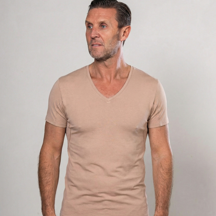 Alca Lite Regular Fit 1-Pck Herren T-Shirt Deep-V Natural ist ein leichtes und luftiges Basic aus der Alca Lite-Kollektion — speziell entwickelt für Männer, die an warmen Tagen und in den Sommermonaten Stil und Komfort wünschen. Dank des dünnen, atmungsaktiven Stoffes fühlt sich dieses Shirt kühl und angenehm an, ideal für heißes Wetter ohne Einbußen bei einer gepflegten Optik.
